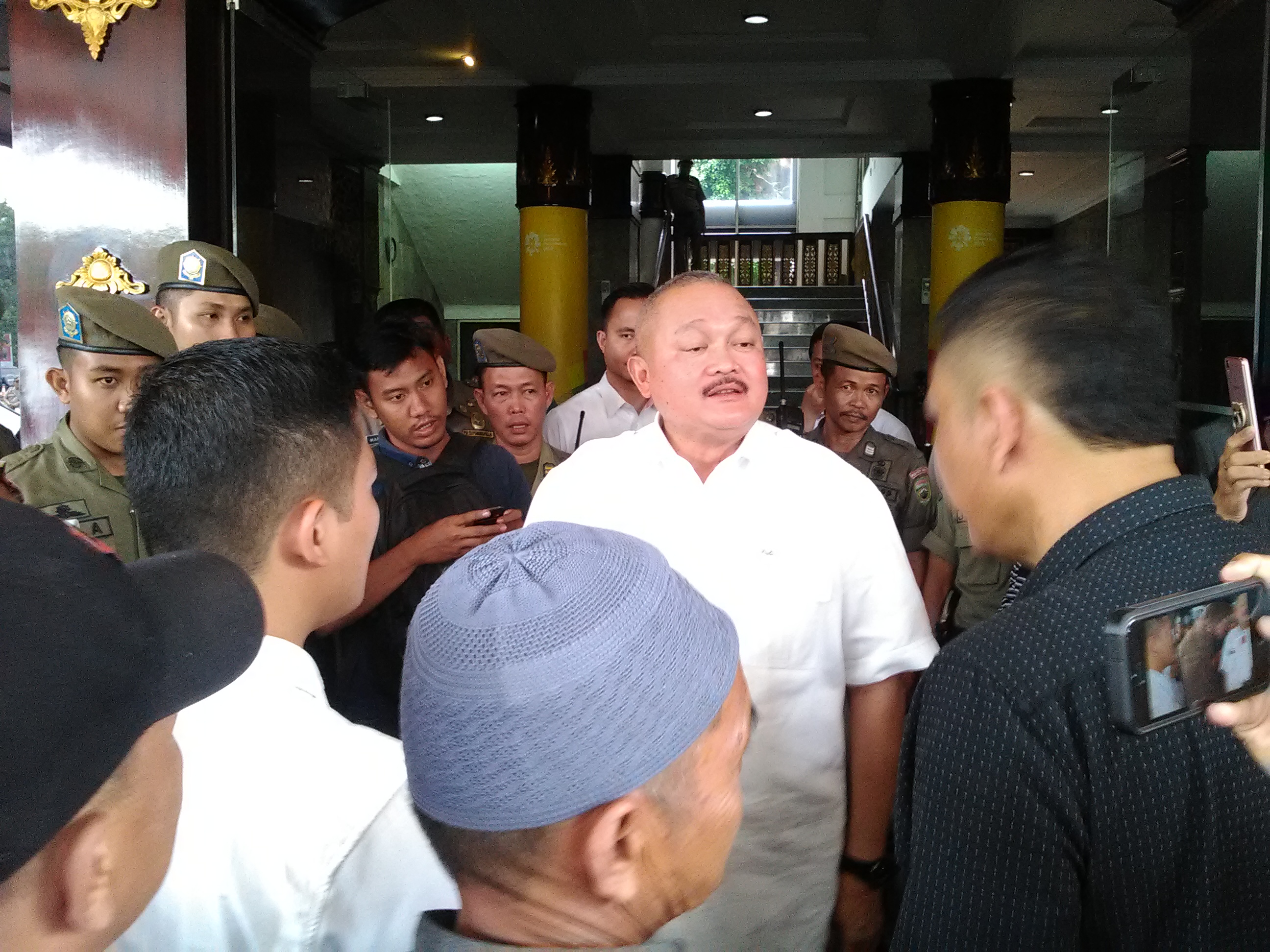 Alex dengan berpakaian kemeja putih langsung menemui para calon jama’ah umroh. Ia pun mengatakan bahwa dirinya belum tahu masalah persis tentang puluhan jamaah Sumsel yang gagal berangkat umroh.
