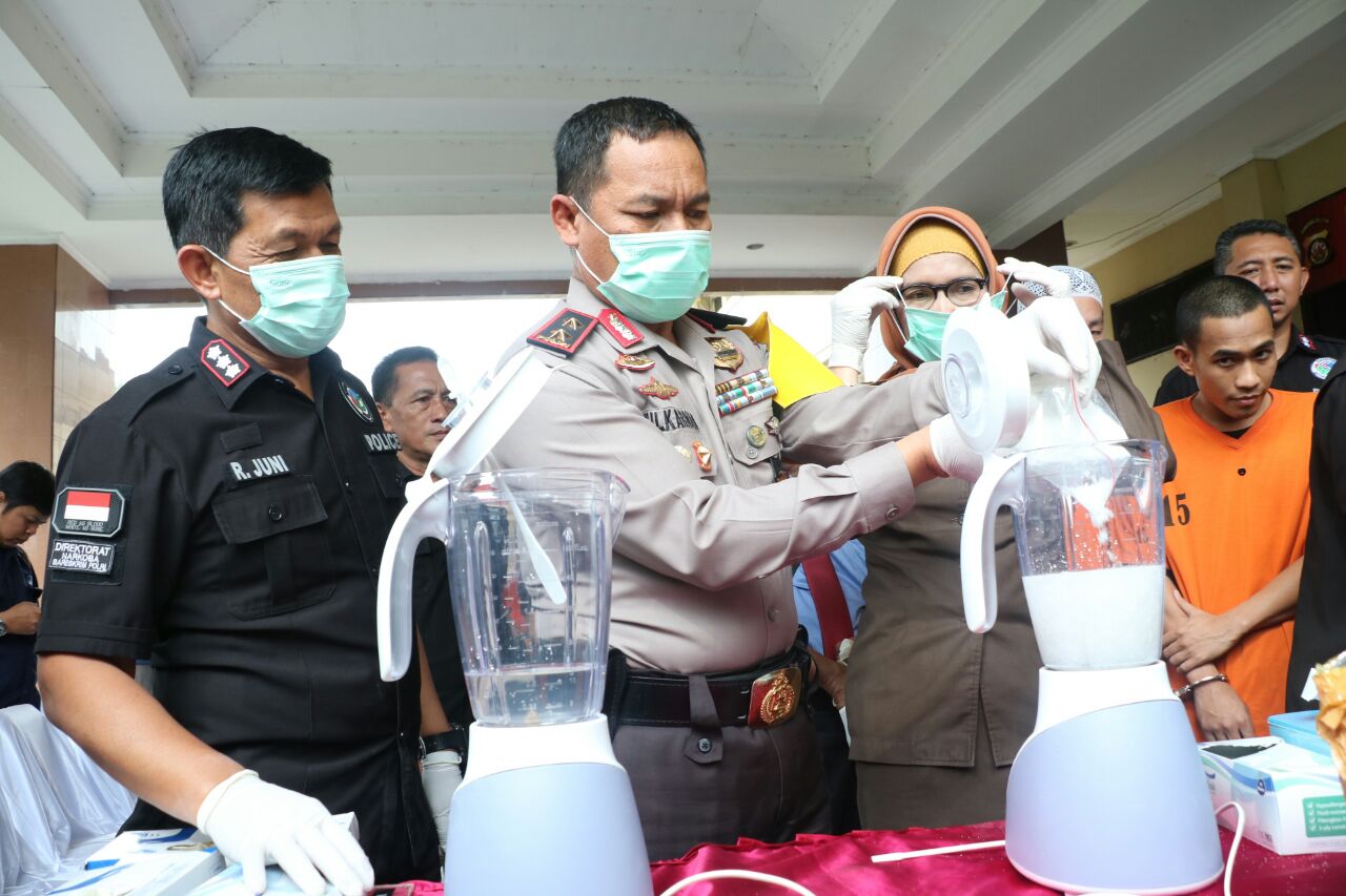 KORDANEWS – Direktorat Reserse Narkoba Polda Sumsel memusnahkan barang bukti 6,6 Kg sabu dan 2.000 butir ekstasi dengan cara diblender. Sejumlah barang bukti yang disita merupakan hasil selundupan jaringan narkotika Internasional.