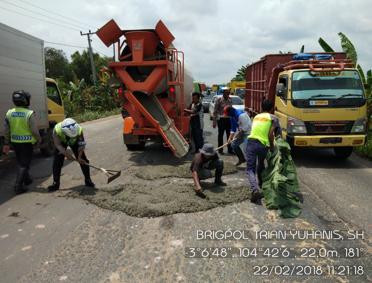 “Polres Ogan Ilir dalam mewujudkan keselamatan berlalulintas disepanjang Jalan Palembang-Indralaya, melakukan kerjasama dengan pihak PT Inti Beton untuk menambal ruas jalan yang berlubang. Hal ini dilakukan, guna mengantisipasi kemacetan dan sekaligus menekan angka kecelakaan lalulintas maupun vatalitas korban laka lantas serta kejahatan lalu lintas lainya,” ujar Kapolres Ogan Ilir AKBP Gazali Ahmad melalui Kasat Lantas AKP Sulis, Kamis (22/02) sore.