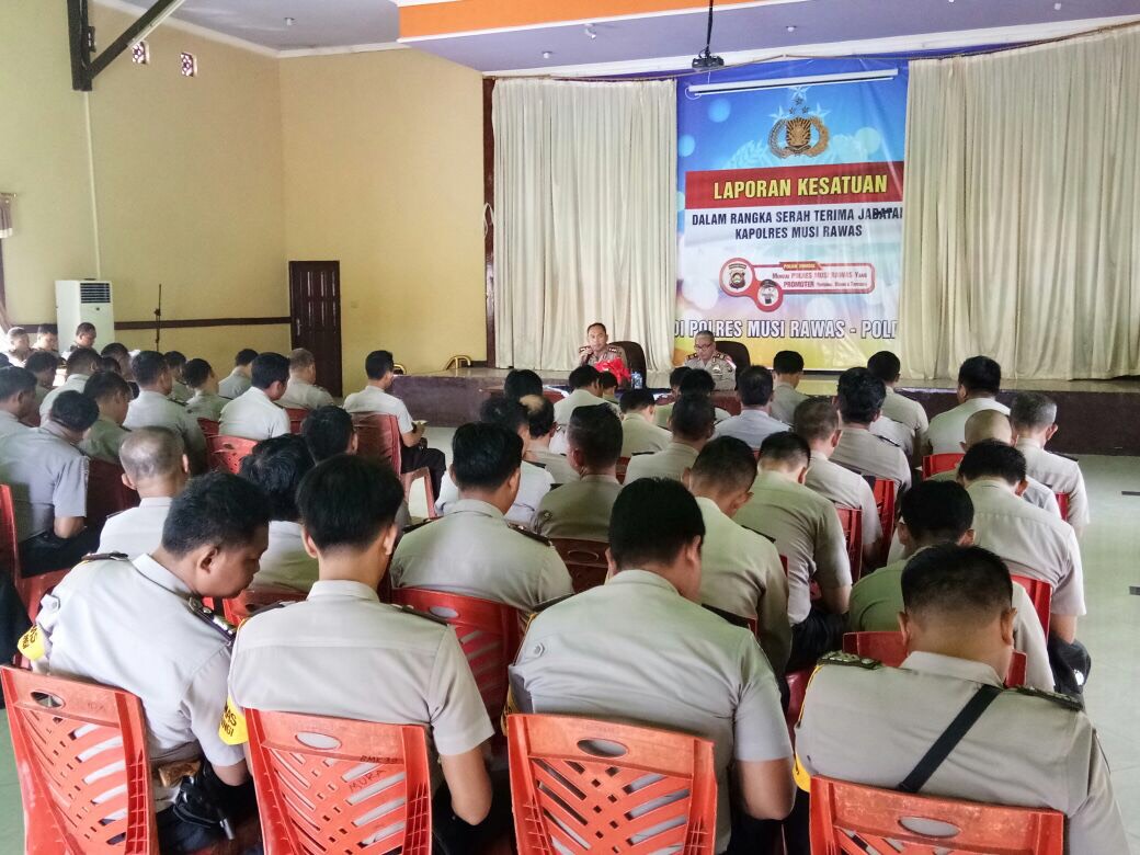 Kapolres Musi Rawas AKBP Bayu Dewantoro, SIK., MM didampingi Kasat Binmas AKP Junaidi memberikan arahan kepada seluruh anggota Bhabinkamtibmas.