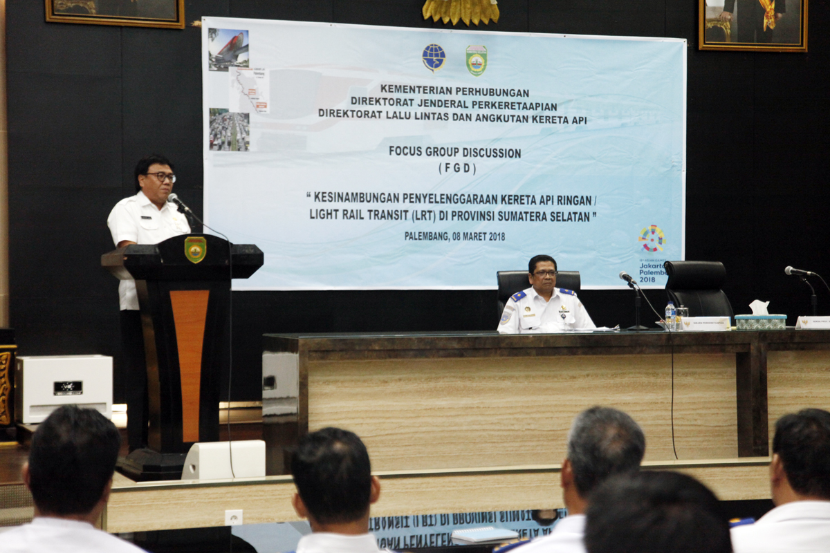 Hal ini disampaikan oleh Direktur Lalu Lintas dan Angkutan Kereta Api, Zulmafendi didampingi Sekretaris Daerah (Sekda) H. Nasrun Umar saat membuka secara resmi Focus Group Discussion (FGD) bertema ” Kesinambungan penyelenggaraan kereta api ringan/light rail transit (LRT) di Provinsi Sumsel”, di Auditorium Bina Praja Provinsi Sumsel, Kamis (8/3).