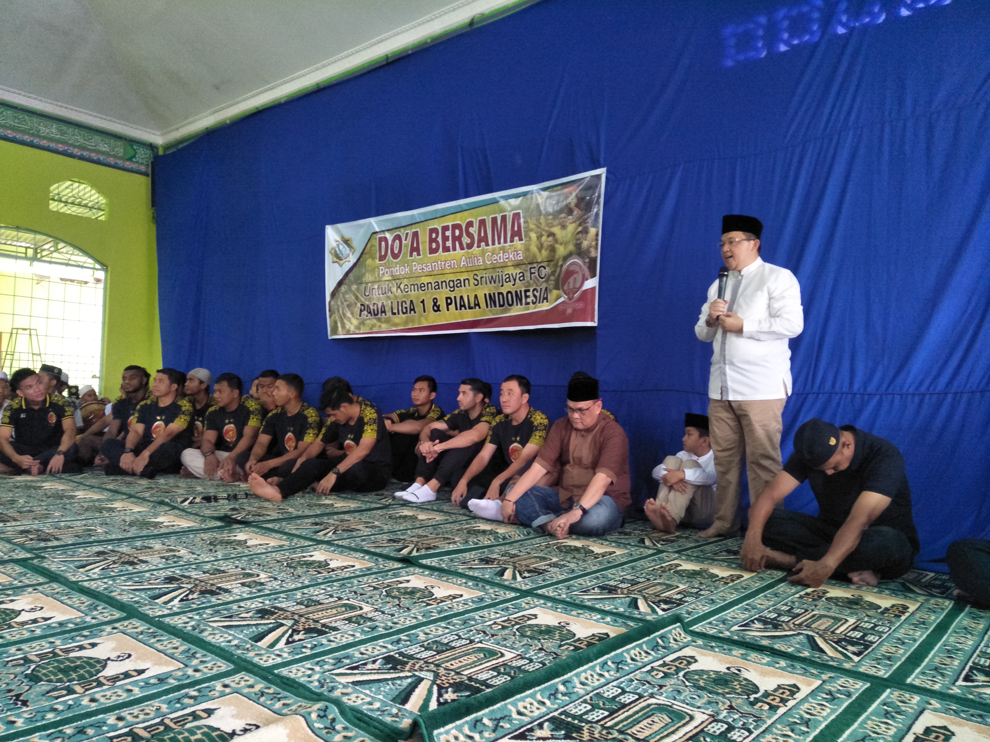 Skuat Sriwijaya FC (SFC) memohon doa restu saat acara Doa Bersama Untuk Kemenangan Sriwijaya FC Pada Liga 1 & Piala Indonesia, Minggu (11/3/2018). Mereka meminta doa dari anak Pondok Pesantren Aulia Cendikia, kawasan Talang Jambe Palembang.