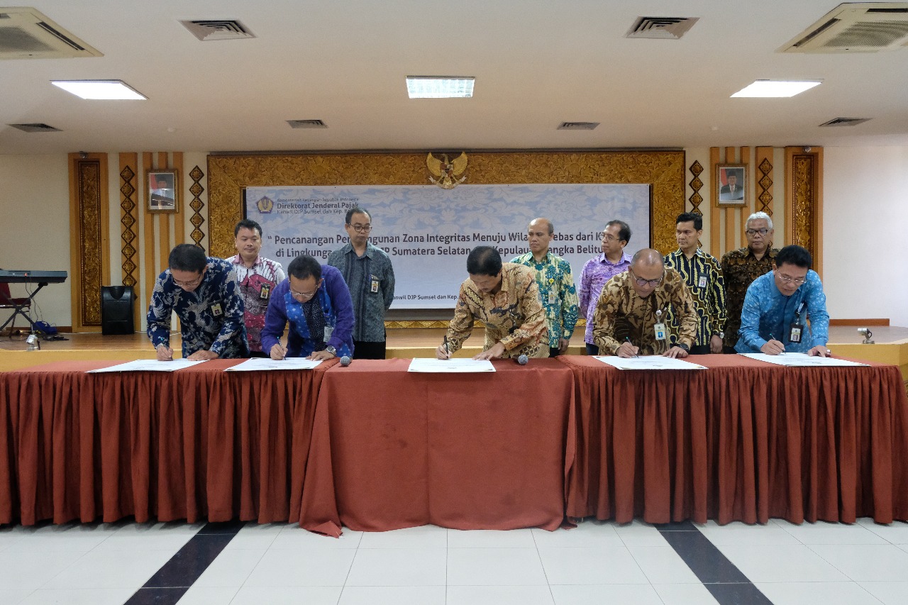 Pencanangan Zona Integritas (ZI) yang disaksikan oleh Perwakilan Ombudsman, Perwakilan Kementerian Keuangan Sumsel, IKPI, AKP2I dan perwakilan dari pendidikan tinggi (Universitas Sriwijaya dan Universitas Katolik Musi Charitas) ditandai dengan penandatanganan Piagam ZI oleh Kepala Kanwil DJP Sumsel Babel M. Ismiransyah M. Zain beserta para Kepala Kantor Pelayanan Pajak Pratama dan Madya yang berada di Kota Palembang serta para pejabat Eselon III di lingkungan Kanwil DJP Sumsel Babel.