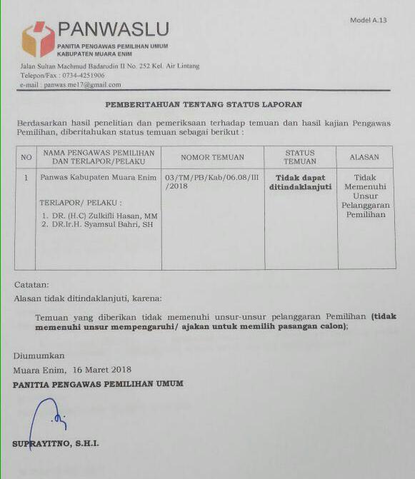 Surat pemberitahuan status laporan ini di keluarkan dan diumumkan oleh Panitia Pengawas Pemilihan Umum ( Panwaslu) Kabupaten Muara Enim 16 Maret 2018 yang ditanda tangani oleh Ketua Panwaslu Kabupaten Muara Enim Suprayitno SHI