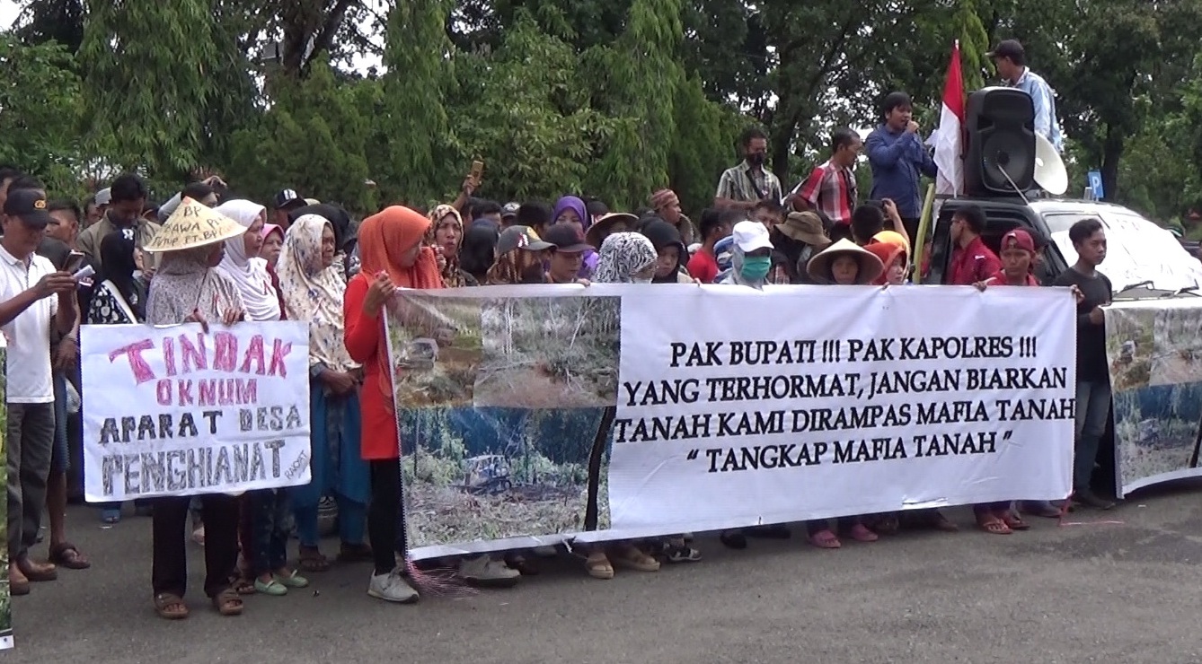 “Kami minta hentikan penggusuran lahan milik masyarakat oleh PT Pribumu Banjar Sari. Tolak tindakan PT Banjar Sari Pribumi membeli tanah dan lahan dari makelar. Ketiga, kami minta pertanggung jawaban Dirut PT Banjar Sari Pribumi atas pengrusakan lahan dan tanaman masyarakat, “teriak Herwinsyah, Koordinator aksi saat menyampaikan tuntutannya.