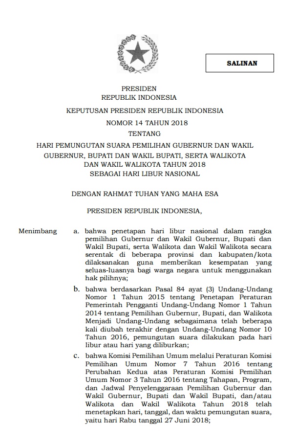 KORDANEWS – Presiden Joko Widodo (Jokowi) memutuskan 27 Juni 2018 yang merupakan hari Pilkada Serentak sebagai libur nasional. Keputusan ini tertuang dalam Keputusan Presiden (Keppres) tentang Libur Nasional.