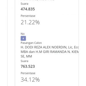 Seperti yang di lansir dari the8news melalui laman detiksumsel, untuk di Sumsel berdasarkan data yang masuk dari 9.236 TPS dari total 16.903 TPS di Sumsel, paslon gubernur dan wakil gubernur Sumsel nomor urut empat Dodi-Giri unggul dengan peraihan 702.520 suara (34,80%) disusul paslon nomor urut satu HD-MY 674.246 suara (33,40%), kemudian paslon nomor urut tiga Ishak-Yudha 425.001 suara (21,05%) dan paslon nomor urut dua Aswari-Irwansyah 216.849 suara (10,74%).