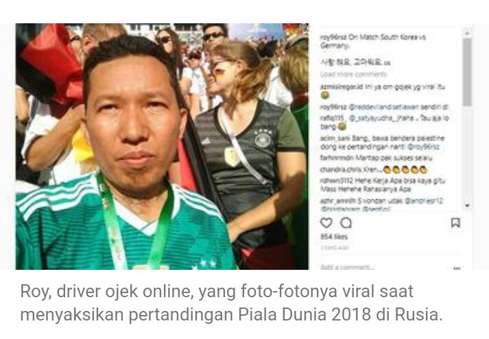 KORDANEWS – Roy Sunandar, driver ojek online yang fotonya viral saat menonton Piala Dunia 2018 di Rusia membawa bekal berupa mi instan dan mi cup sebanyak satu tas.