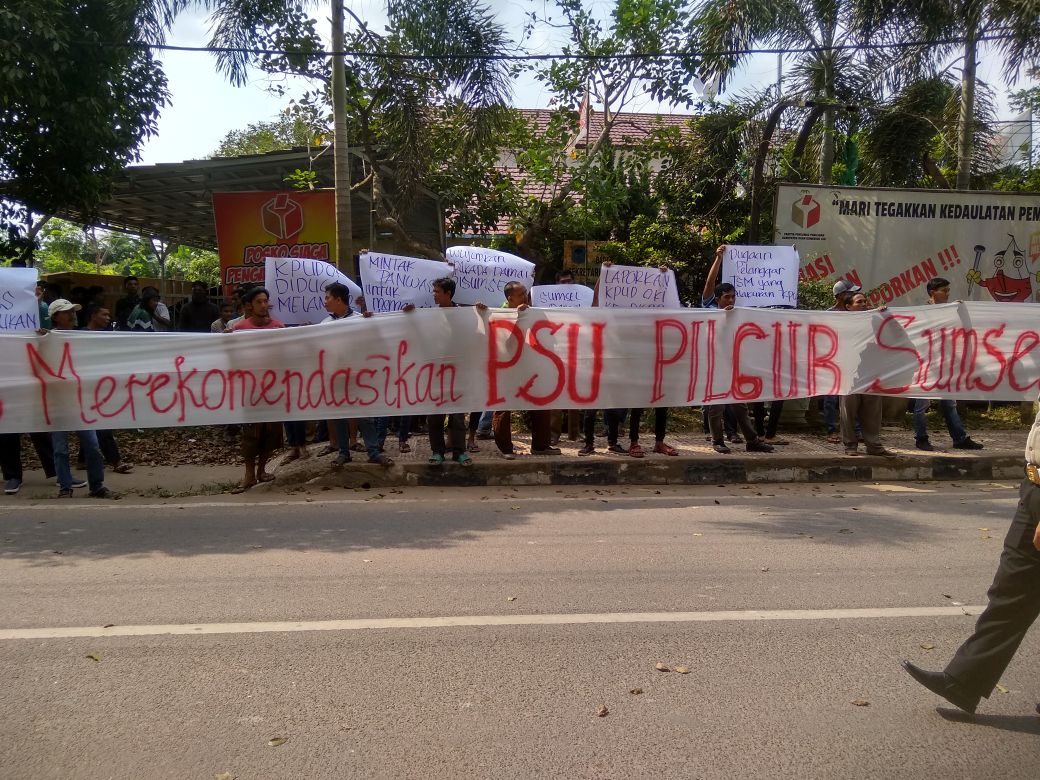 massa membawa spanduk, karton yang diantaranya bertuliskan “meminta Panwaslu segera memanggil KPU OKI”, “merekomendasikan PSU Pilgub Sumsel”, dan PSU harus dilakukan.