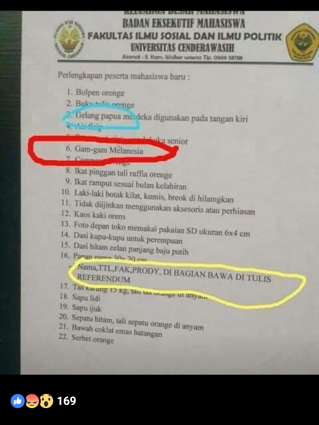Selain itu, secerca foto yang memperlihatkan edaran kewajiban perpengkapan yang harus digunakan Maba dari Badan Eksekutif Mahasiswa (BEM). Diantaranya mengenakan gelang Papua merdeka di tangan sebelah kiri.
