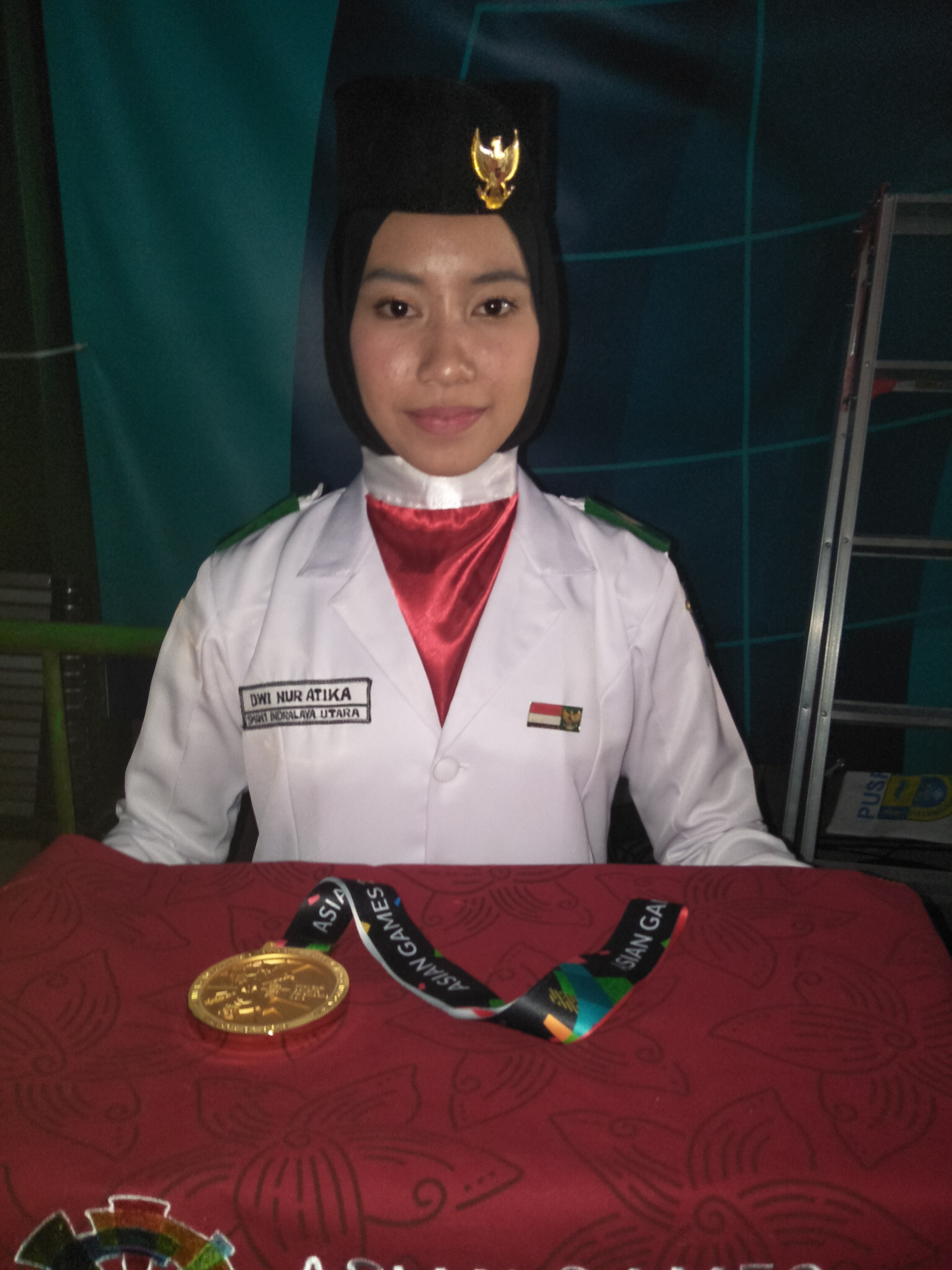 Emas tersebut dipersembahkan oleh Aries Susanti Rahayu di nomor Womens Speed Sport Climbing. “Gementaran kak, soalnya takut salah saat penyerahannya,”kata Atika sebelum upacara prosesi penyerahan emas Kamis,(23/8).