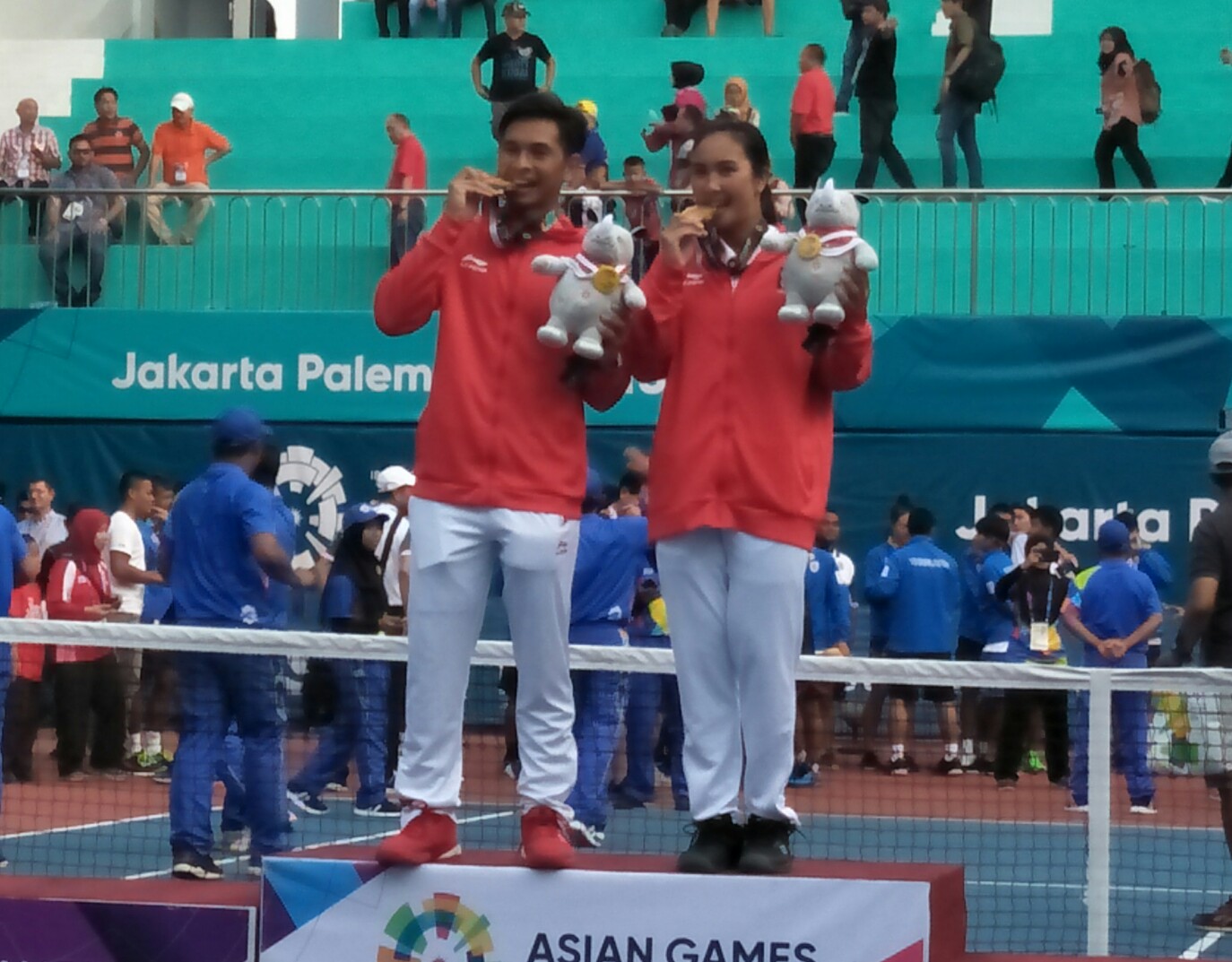 Keduanya mempersembahkan emas usai melibas tim Voli ganda campuran asal Thailand, Sonchat Ratiwatana/Luksika Kumkhum, 6-4, 5-7 dan 10-7, di lapangan tenis JSC.