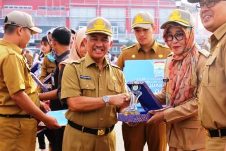Usai apel Sekda memberikan penghargaan bagi pemenang lomba 10 program pokok PKK untuk juara I Kelurahan Sei Buah, disusul juara ke-2 Kelurahan 20 Ilir DIII, kemudian Kelurahan 1 Ulu di posisi ke-3.