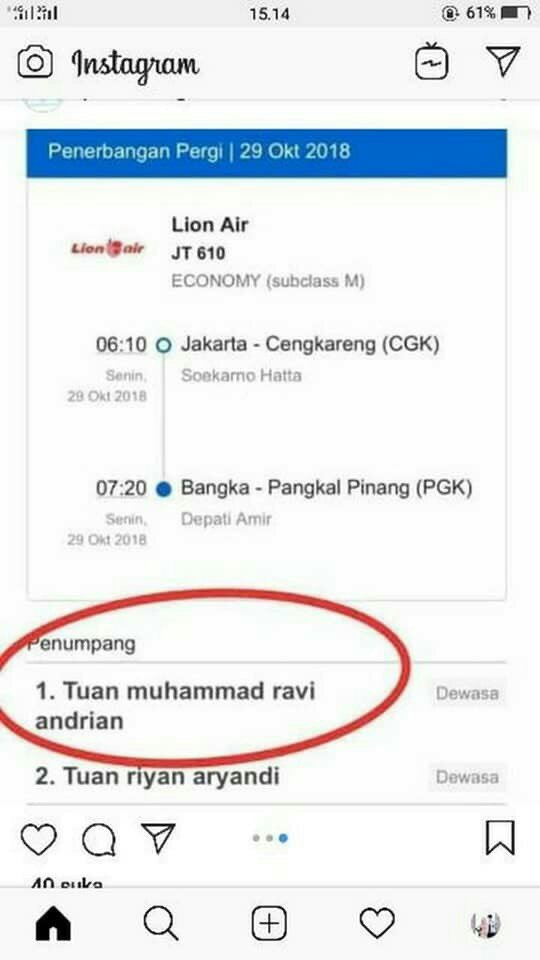 “Ravi sudah 1 tahun ini bekerja di perusahaan ekspedisi timah di Pangkal Pinang. Usai menonton pertandingan bola rencana akan pulang ke Bangka dengan menumpang pesawat Lion Air JT610 yang diketahui hilang kontak setelah lepas landas,” ujarnya.