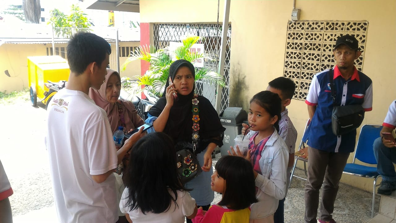 Ditemani keempat anaknya, keluarga dan para driver taksi online, istri korban Fitriani (32) tampak duduk lesu menemani anak sulungnya M Rafly Tiandy (14) yang sedang melakukan tes DNA.