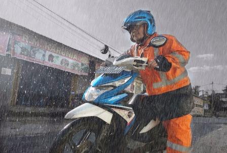 pengguna motor honda tidak disarankan menerobos banjir, walaupun tak sedikit pengendara yang tak punya pilihan selain menerobos genangan karena harus cepat sampai tujuan.