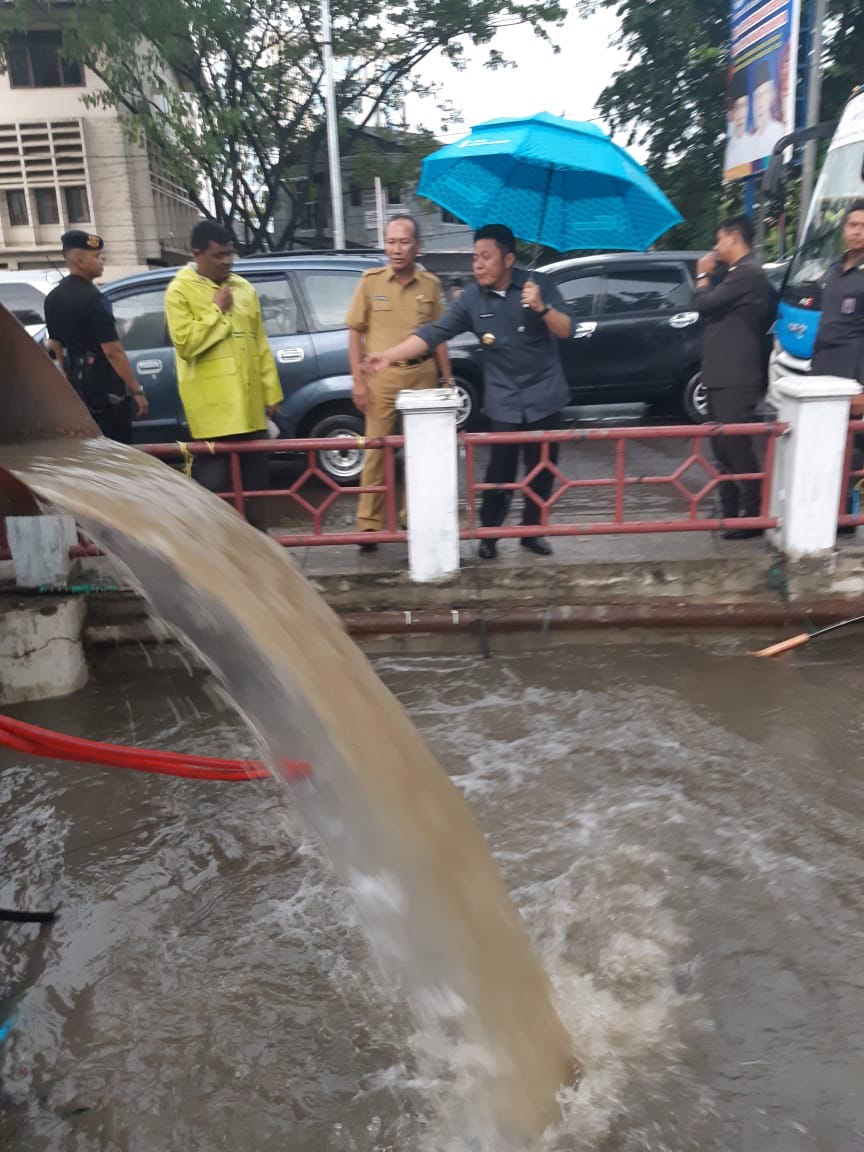 KORDANEWS — Gubernur Sumatera Selatan, Herman Deru bersama Wakil Gubernur Sumsel, Mawrdi Yahya secara sepontan memantau pompa air yang ada di depan Taman Mandiri dan juga di Sungai Baung yang ada di Simpang Lima dekat Hotel