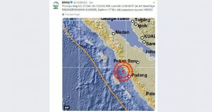 KORDANEWS – Badan Meteorologi, Klimatologi, dan Geofisika (BMKG) merilis informasi gempa terbaru di Padang Pariaman, Sumatera Barat, Minggu (23/12/2018).