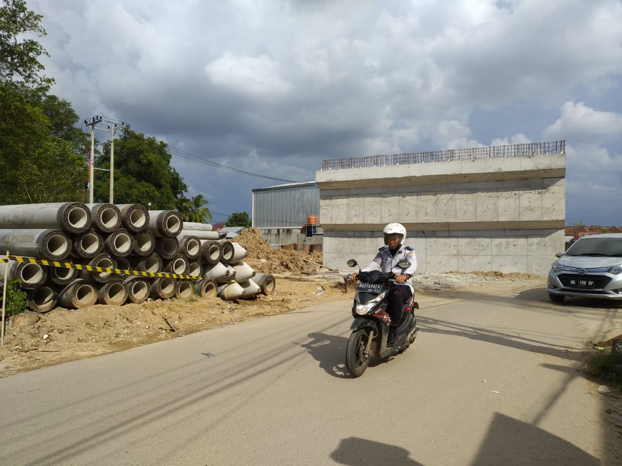 Terlihat puluhan paku bumi dibiarkan tergeletak di bawah jalan pendekat yang belum selesai pengerjaannya dan tak ada seorang pun pekerja yang bertugas.