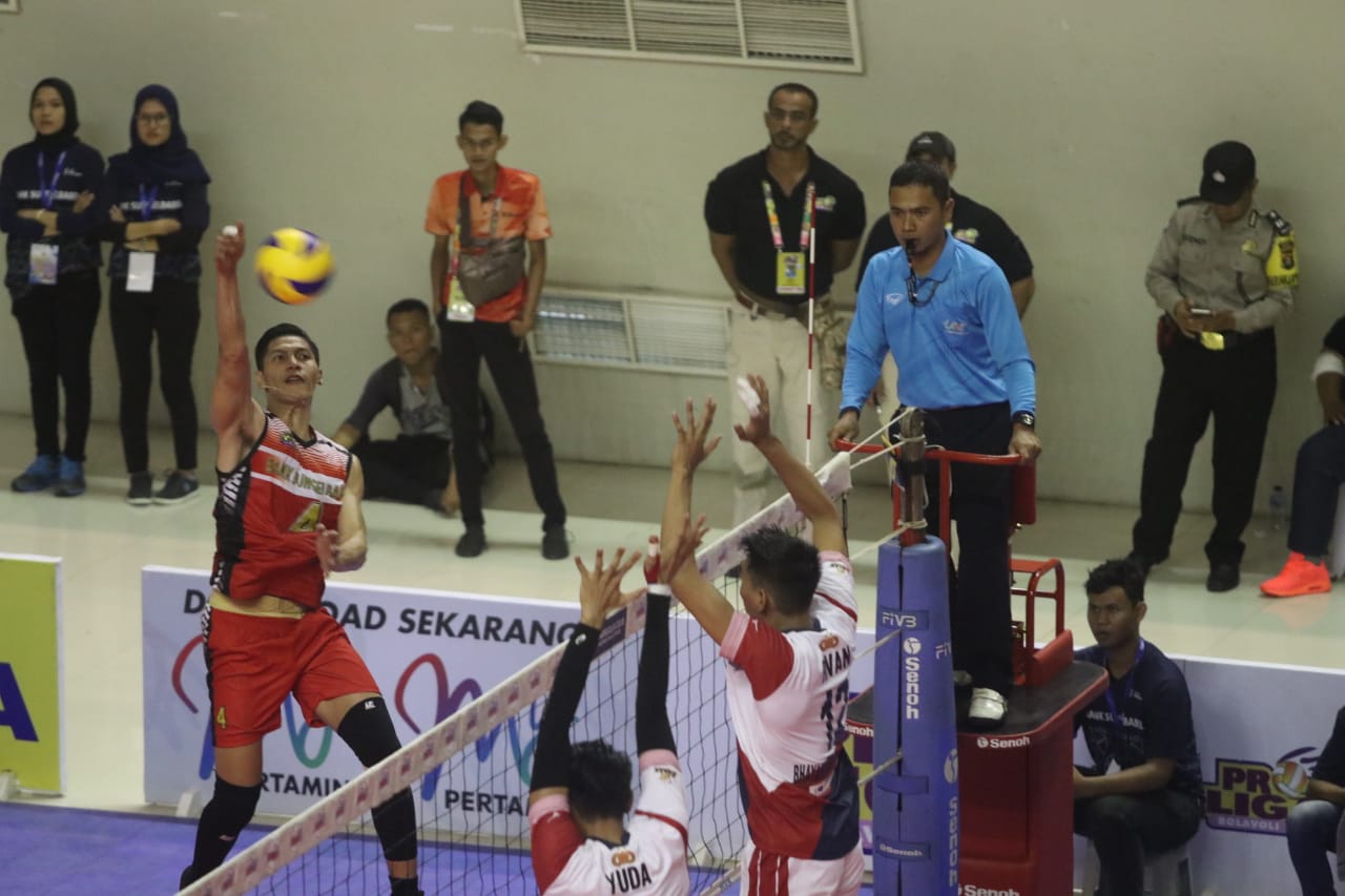 KORDANEWS – PerhelatanProliga 2019 putaran kedua seri pertama kembali mempertemukan tim Surabaya Bhayangkara Samator dengan tuan rumah Palembang Bank SumselBabel, yang berlangsung di GOR PSCC Palembang, Sumatera Selatan, Jumat (11/1/2019).