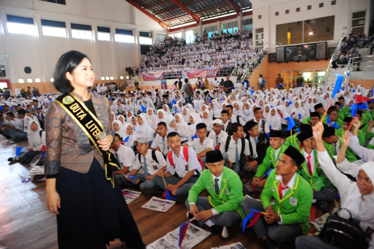 KORDANEWS-Spektakuler! Safari perdana Sumsel Mambaca Duta Literasi Sumsel Hj Percha Leampuri B Bus MBA, bersama Harian Umum Palembang Pos, di Kabupaten Lahat, banjir peserta. Acara yang digelar di GOR Bukit Telunjuk Kabupaten Lahat, Selasa (15/1) itu, dihadiri sekitar 5.000 siswa SMA/SMK se Kabupaten Lahat.
