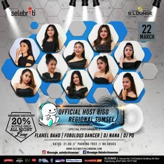 KORDANEWS-Malam ini S-Lounge Selebriti Entertainment Center Jl. Veteran Palembang Bakal hadirkan Official Host Bigo Regional Sumsel pada hari Jum’at, 22 Maret 2019.