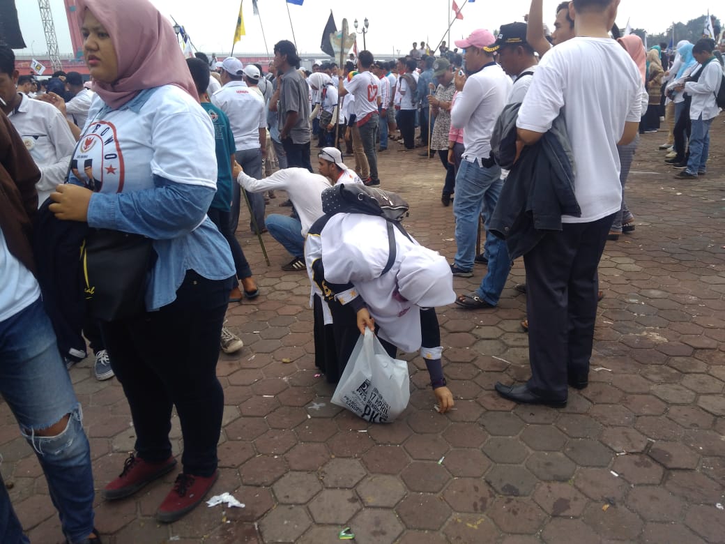 Namun, usai Prabowo meninggalkan panggung, sejumlah relawan yang mengenakan seragam putih dan pendukung lainnya tampak memungut satu per osatu bekas makanan dan botol air mineral yang tertinggal.
