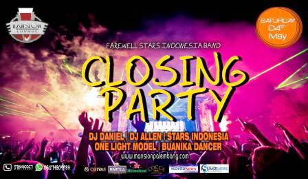 “Mansion Club Proudly kembali menghadirkan Gelar acara Closing Party dan Ferewell Stars Indonesia pada hari Sabtu, tanggal 4 Mei 2019, serta menurunkan semua bintang yang diantaranya DJ Daniel, DJ Allen, Stars Indonesia, One Light Model serta Buanika Dancer yang bisa juga free Play Billiards all Nite Long, “Ujar Manager Mansion Executive Club Palembang, Stave Wibisono, kepada kordanews.