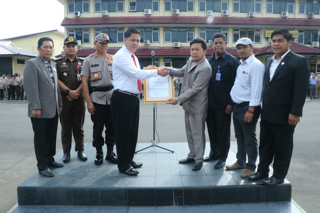 Penghargaan ini diberikan langsung oleh Direktur Eksekutif Lembaga Kajian Strategis Kepolisian Indonesia Dr Drs Edi Hasibuan SH MH kepada Kapolda Sumsel Irjen Pol Zulkarnain Adinegara Direktur Reserse Narkoba Polda Sumsel Kombes Pol Farman dan Wadir Reserse Narkoba Polda Sumsel AKBP Amazona Felomonia di lapangan apel Mapolda Sumsel Kamis (16/5).