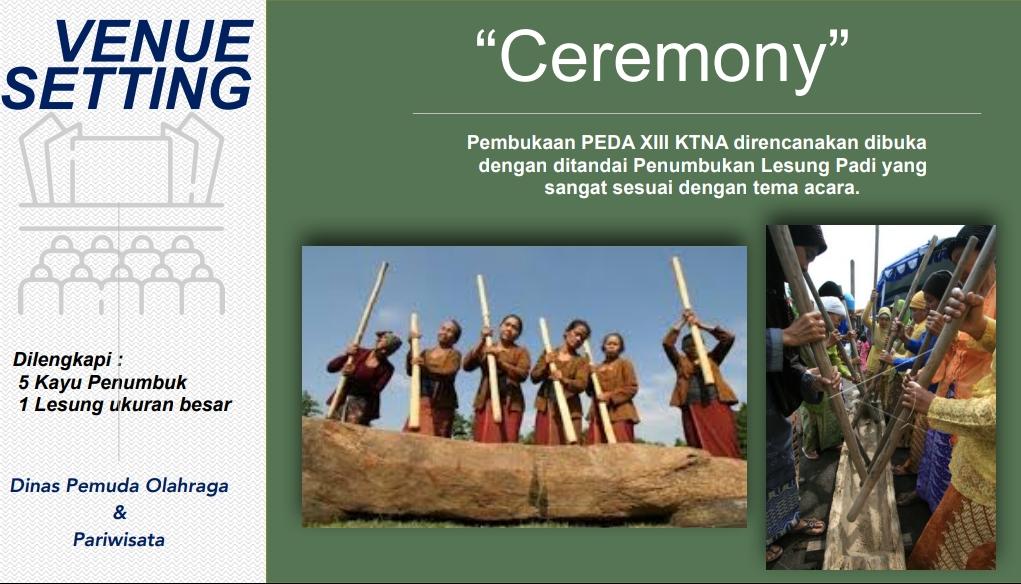 “Nah, pada saat opening ceremony (pembukaan acara resmi, baca) nanti akan ditandai dengan kegiatan Penumbukan Lesung Padi yang tentunya sangat sesuai dengan tema kegiatan PEDA KTNA ini,” dan juga akan ada beberapa Tarian tradiosional yang nantinya akan ditampilkan saat pembukaan ungkap Dodi Reza Alex Noerdin Selaku Bupati Musi Banyuasin