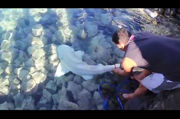 Hiu unik itu, kemudian diikat warga di bagian ekor dan dibiarkan berenang di bawah dermaga speed boat, sehingga menjadi tontonan warga. Melihat hal tersebut, pihak pelabuhan langsung melakukan pelepasan spesies unik tersebut kembali ke habitatnya.
