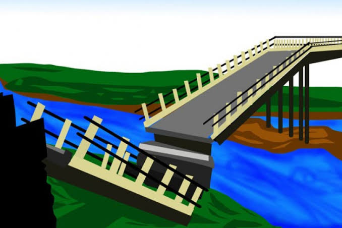 Bukan itu saja, truk tronton yang memiliki panjang dari depan hingga bak belakang 8,8 meter warna hijau terjebak di tengah ambruknya jembatan tersebut.