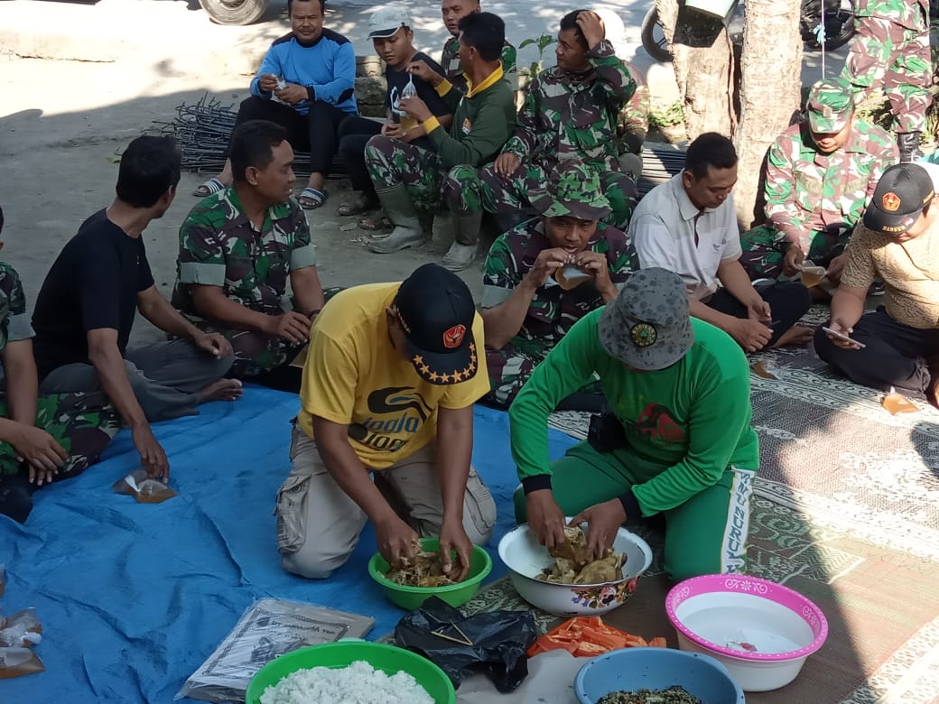 Danramil 01/Demak kota Kapten Kav Karmadi dan Kepala Desa Kalikondang Asif Barchiya serta Satgas TMMD bersama warga duduk bersama diatasi tikar.