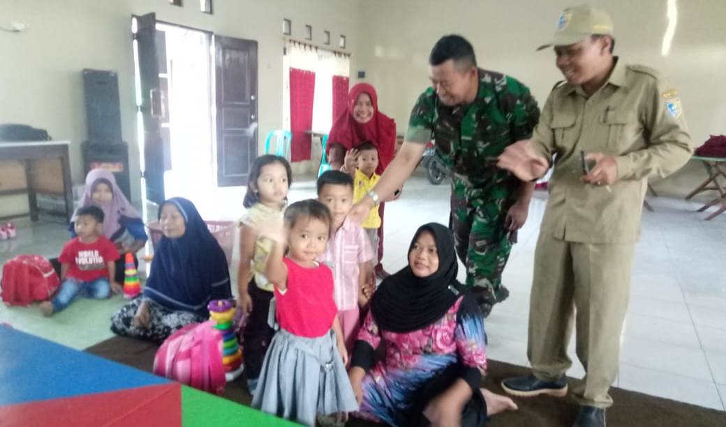 Tidak hanya sekedar mampir, Serda Jamaludin menyempatkan mengajak bermain kepada anak-anak Paud di ruang Balai Desa Kalikondang (desa sasaran TMMD Reguler Kodim Demak).