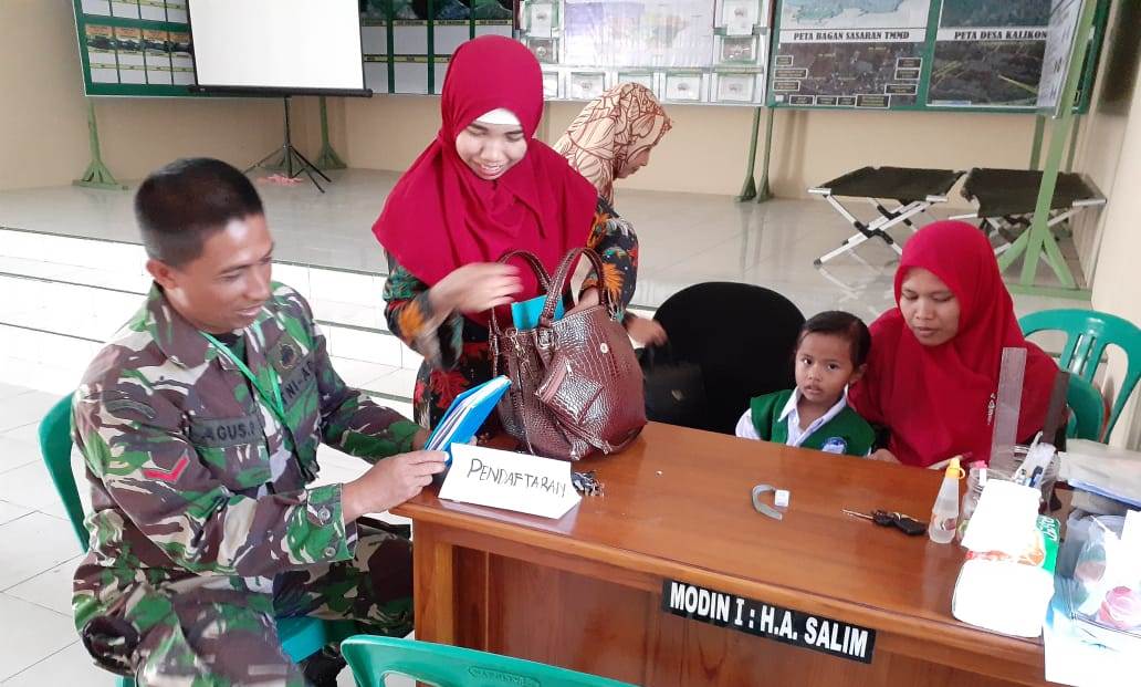Seperti yang dilakukan Koptu Agus, salah satu anggota Satgas TMMD Kodim Demak. Di sela-sela kesibukannya bekerja di pembangunan fisik, dia menyempatkan untuk menyambangi dan memperhatikan PAUD “Semeru” yang ada di balai Desa Kalikondang.