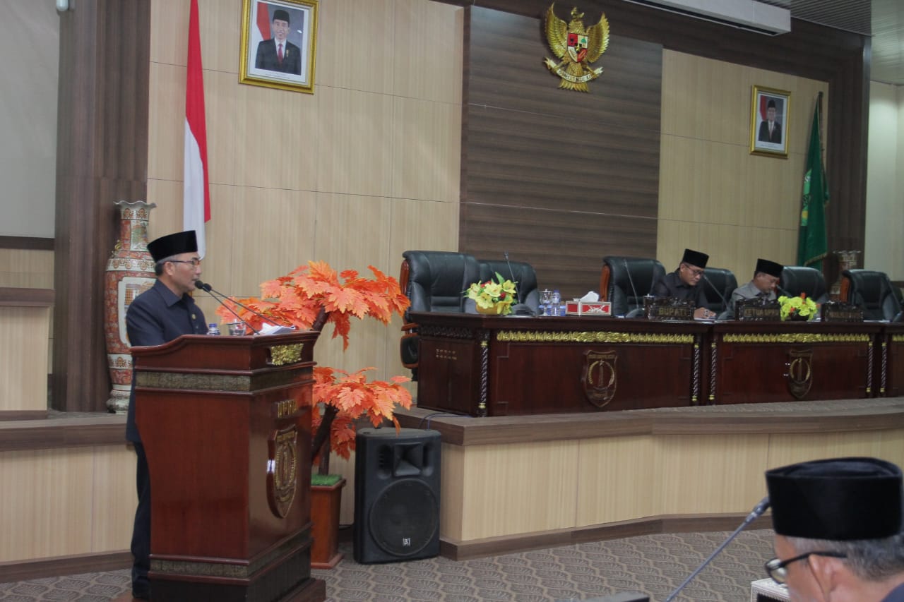 KORDANEWS – Bupati Musi Banyuasin H Dodi Reza Alex Noerdin diwakili oleh Sekretaris Daerah Kabupaten Muba Drs H Apriyadi MSi menyampaikan Raperda tentang APBD Perubahan Kabupaten Muba tahun anggaran 2019, pada Rapat Paripurna Masa Persidangan II Rapat ke – 20 di Ruang Rapat Paripurna DPRD Muba, Senin 12/8/2019).