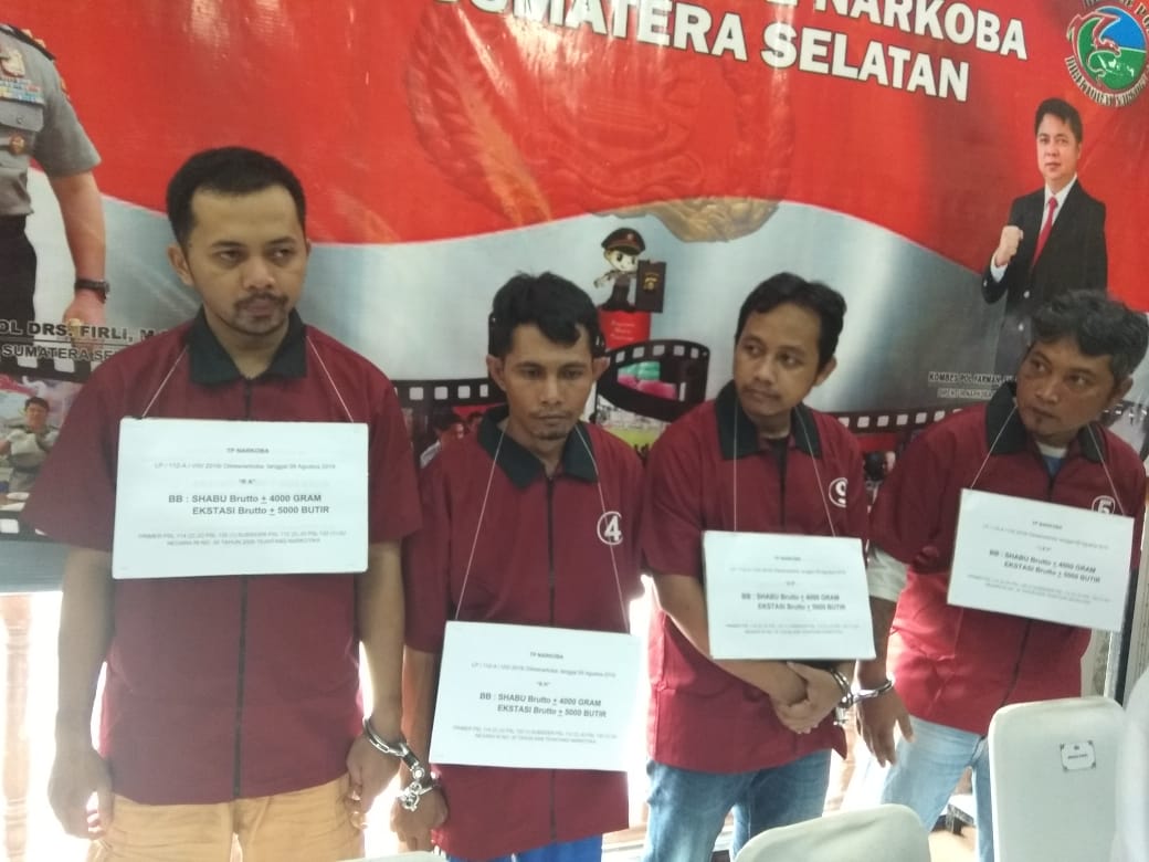 KORDANEWS — Ditresnarkoba Polda Sumsel berhasil mengungkap Narkotika Jenis Sabu seberat empat Kilogram dan lima bungkus pil ekstasi dari empat tersangka yang akan diedarkan di Sumsel.
