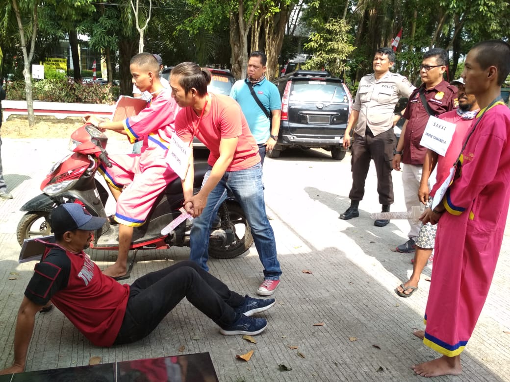 KORDANEWS — Rekonstruksi penganiayaan yang menewaskan M Yusuf Ibrahim pada Oktober 2018 lalu , digelar di halaman Mapolsek IT I , Kamis (29/8). Adegan pembunuhan langsung diperankan Rafli Rifaldi dan Alfandi Aldi.