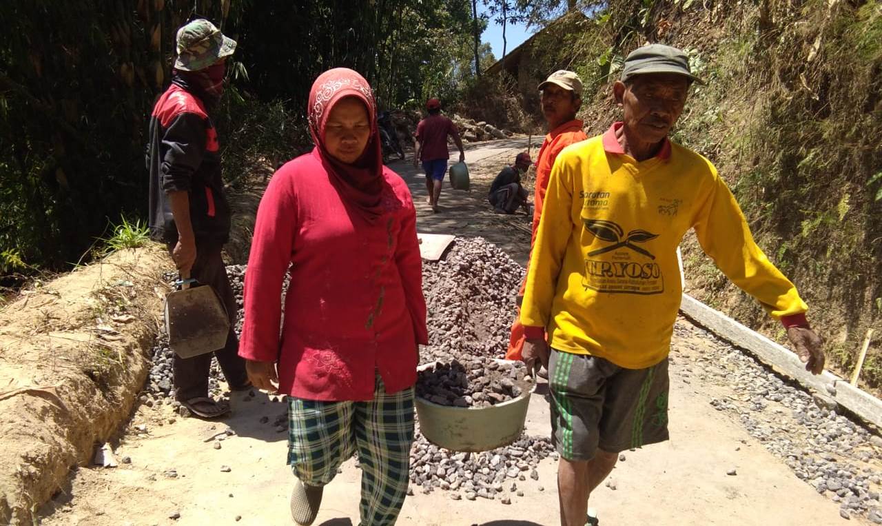 Lami (37) Ngadinem (45), dua Srikandi, warga Dukuh Jenekan RT 18/ RW 03, Desa Sangup itu yang setiap harinya, bergabung dengan kaum bapak-bapak ikut bekerja di pengecoran jalan TMMD. Usut punya usut, ternyata Lami menggantikan suaminya yang tidak bisa ikut bergotong royong lantaran bekerja mencari nafkah sebagai penjual sayuran keliling.