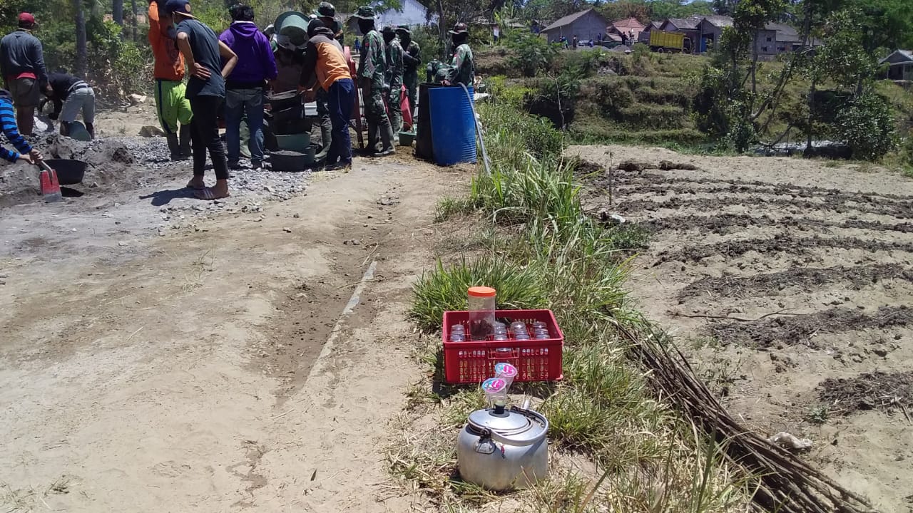Untuk antisipasi hal itu, di sepanjang jalan dekat pengecoran jalan disiapkan sejumlah air dalam galon. ”Yang nyiapkan juga warga, mereka sadar bekerja di bawah terik matahari tentu akan mudah kehausan, untuk itu mereka berinisiatif untuk menyiapkan sejumlah galon air di dekat pekerjaan,” ujar Babinsa Desa Sangup, Seka Rosyd.
