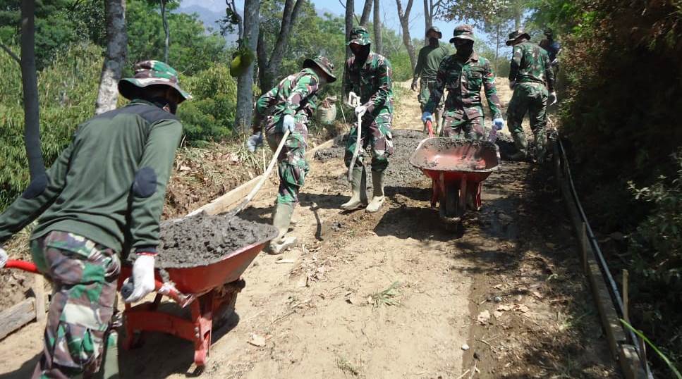 ”Kalau tidak dilakukan bersama, berat saat melangsir adonan pasir, semen dan koral hingga ke titik pengecoran jalan. Medannya yang menanjak, dan salah satu alat bantu yang paling efektif untuk melangsir hanyalah angkong. Itupun harus dilakukan bersama-sama,” ujar Kopka Agung, salah seorang anggota Satgas TMMD Kodim Boyolali.