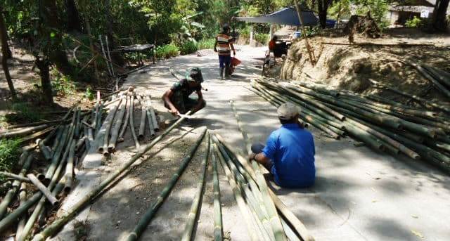 Untuk itu sejumlah warga setempat dikerahkan untuk memenuhi kebutuhan bambu itu. Beruntung, meski seberapapun banyak bambu yang dibutuhkan semuanya tinggal mengambil di desa setempat tanpa harus membayar.