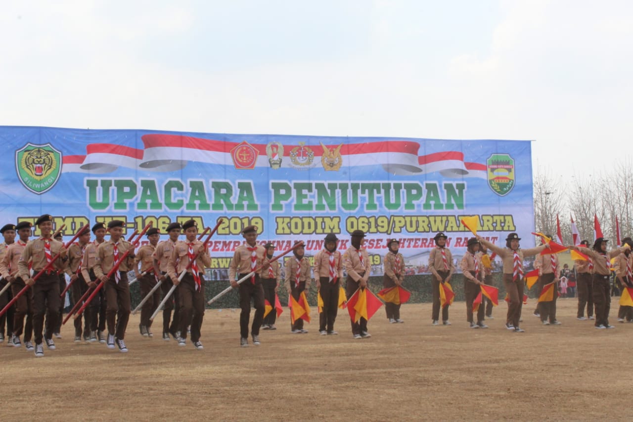 Para pelajar yang tergabung dalam Pramuka menampilkan kemampuan terbaiknya, sebagai partisipasi atas dukungan terhadap pelaksanaan program TMMD ke 106, yang ditutup secara resmi oleh Pangdam III/Siliwangi, Letjen TNI Tri Soewandono.