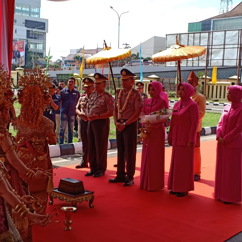 KORDANEWS — Tarian Tanggai dan Sekapur Sirih menyambut kedatangan Kapolda Sumsel Irjen Pol Drs Priyo Widyanto MM dan istri dihalaman Mapolda Sumsel Senin (25/11).