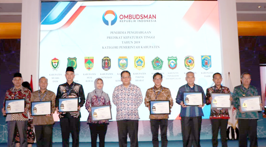 KORDANEWS – Plt. Bupati Muara Enim, H. Juarsah, SH bersama dengan 2 Kementerian, 12 Pemerintah Provinsi, 71 Pemerintah Kabupaten/Kota telah menerima Penganugerahan Predikat Kepatuhan Standar Pelayanan Publik Tahun 2019 yang diserahkan oleh Anggota Ombudsman Republik Indonesia, Prof. Drs. Andrianus Meliala, M.Si., M.Sc., Ph.D bertempat di Grand Ballroom JS Luwansa Hotel Jakarta, Rabu tanggal 27 November 2019 (27/11).